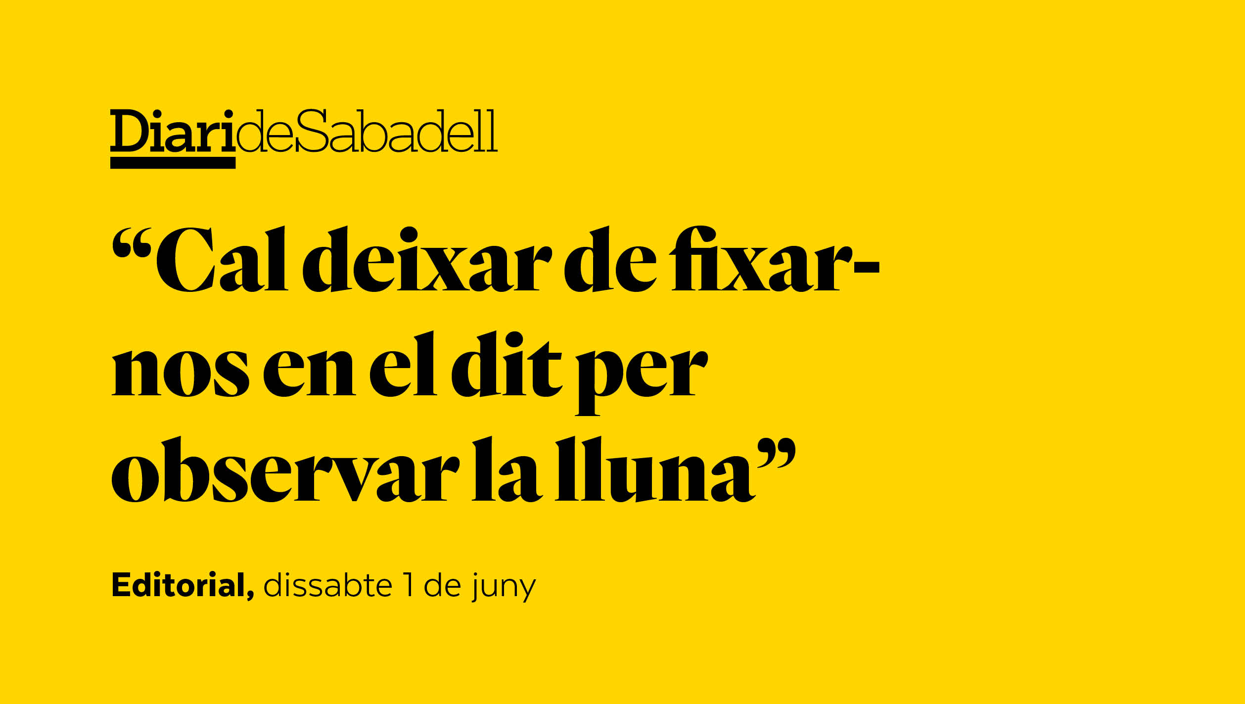 Després de tanta política cal deixar de fixar-nos en el dit (els polítics, les eleccions) per observar la lluna (Sabadell i els sabadellencs). Fent aquest exercici, avui, trobem almenys tres motius per estar orgullosos de Sabadell. Primer: l’esport i la seva festa ens han demostrat aquest any més vitalitat que mai, amb uns esportistes de nivell mundial –la Maica García és la millor jugadora del món, i de Sabadell– i unes entitats amb capacitat de construir, amb l’Ajuntament (menció especial d’una Marisol convertida en la “gran dama” de l’esport) projectes de futur per a la ciutat: és un exemple que cal replicar.