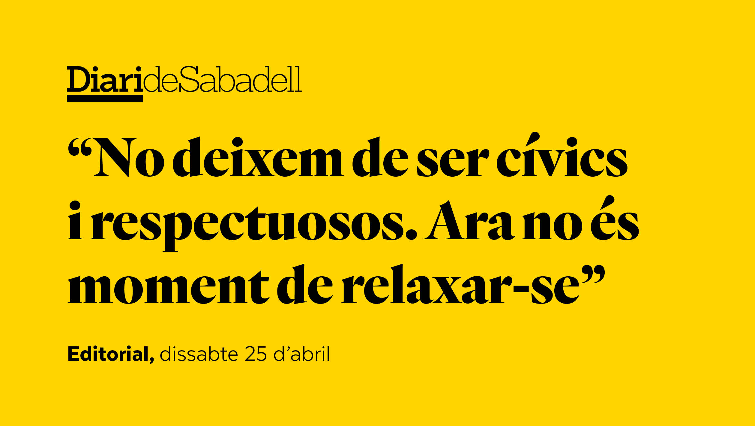Les dades mostren que existeix una majoria social que respecta les normes establertes, tal com assenyala el conseller d’Interior en la seva primera entrevista al Diari de Sabadell. I és més, davant la crisi de la Covid-19 s’han reduït alguns delictes, com els furts i els robatoris en establiments, una de les poques bones notícies derivades del règim d’aïllament. Aquest diumenge, el control policial es trobarà amb una novetat transcendental: la sortida parcial dels menors d’edat. Comença la desescalada, però això no ha de voler dir que deixem de ser cívics i respectuosos. Ara no és moment de relaxar-se.